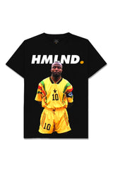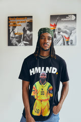 The front features the HMLND logo and a graphic of Pelé, arguably his most iconic shot in a Black Stars jersey, from 19th January 1996, when he captained the Black Stars to victory against Tunisia in Port Elizabeth. The back is adorned with a classic jersey-reminiscent print.